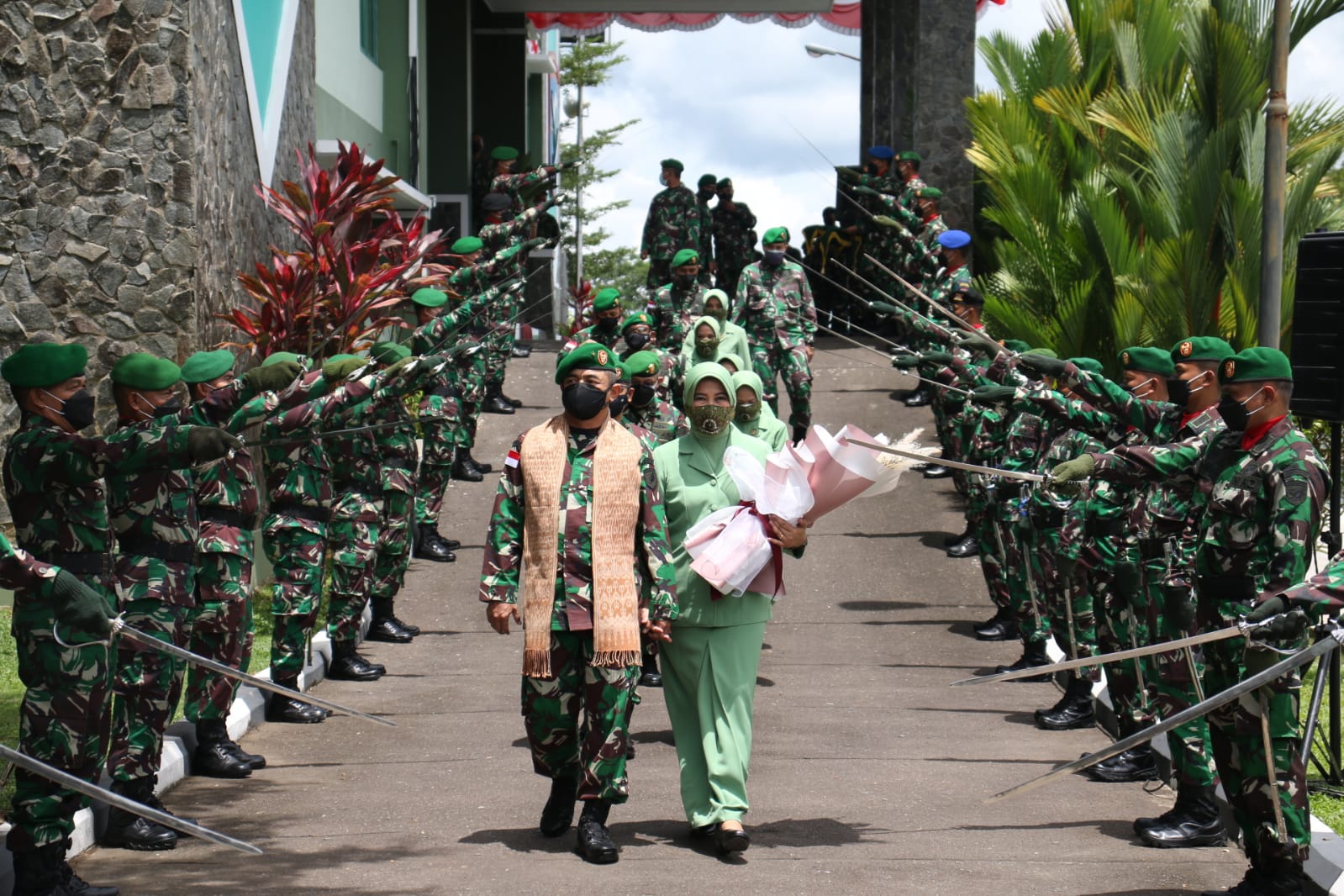 “Brigjen TNI Djaka Budhi Utama didampingi istri secara perlahan melewati pagar barisan Perwira Pedang Pora sekaligus melalui prajurit, Pegawai Negeri Sipil (PNS) dan Persatuan Istri Prajurit (Persit) Kodam XII/Tanjungpura. Dilanjutkan dengan menerima hormat jajar dari Regu Jaga Makodam XII/Tanjungpura,” terang Hendra, Selasa (21/8/21).