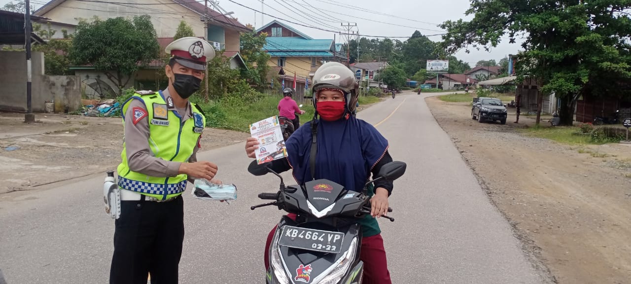 Channeltujuh.com, SEKADAU — Disiplin berlalu lintas dan disiplin protokol kesehatan (prokes) terus diupayakan Kepolisian Resor (Polres) Sekadau melalui Satuan Lalu Lintas (Satlantas) kepada para pengguna jalan dengan cara membagikan masker, sticker dan penyuluhan keliling (penling).