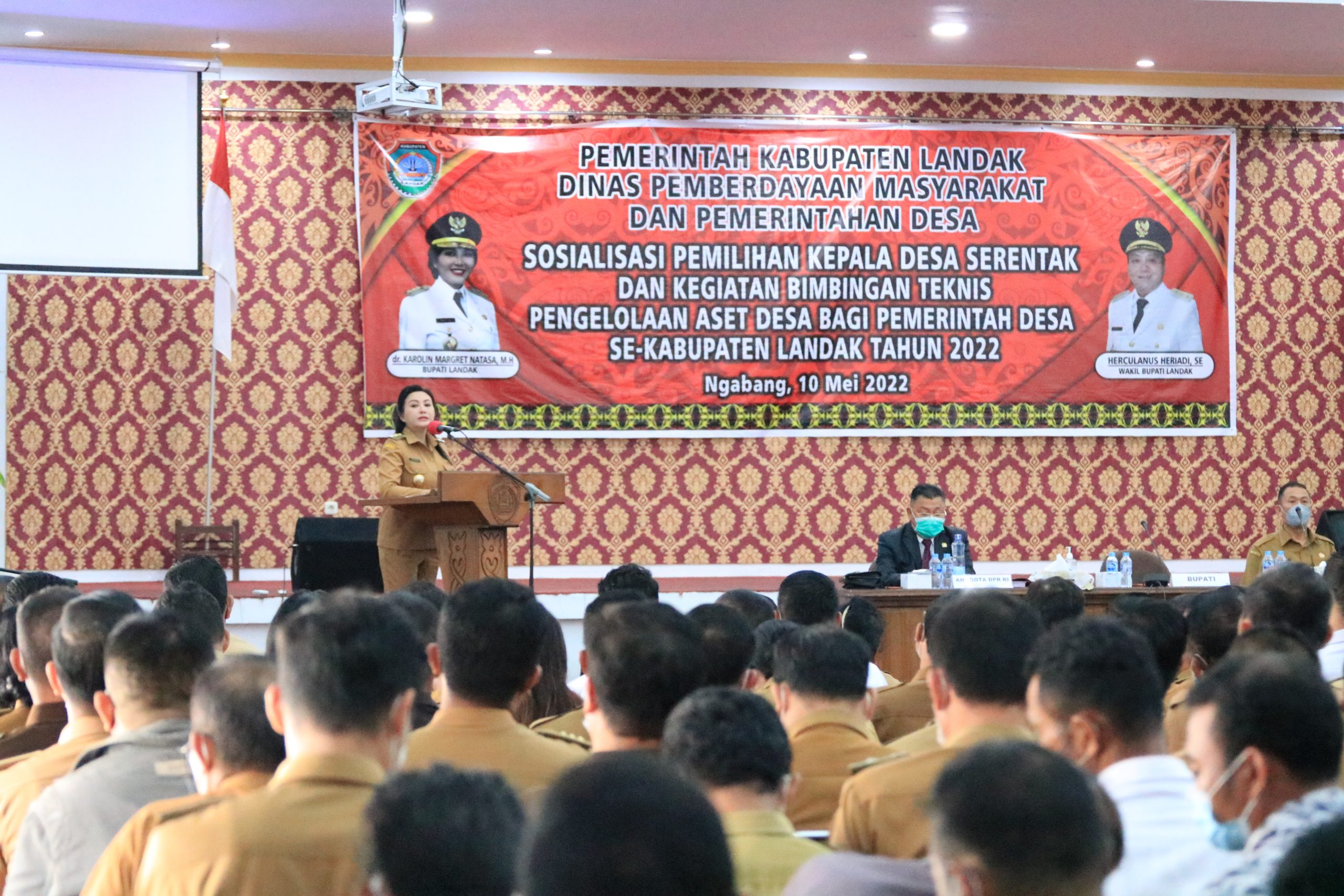 Channeltujuh.com, NGABANG – Bupati Landak Karolin Margret Natasa meminta seluruh kepala desa untuk memahami tahapan pemilihan kepala desa yang akan digelar secara serentak pada tahun 2022. Hal ini disampaikannya dalam acara sosialisasi pemilihan kepala desa serentak dan bimbingan teknis pengelolaan aset desa bagi pemerintah desa tahun 2022 di Aula Kantor Bupati Landak, selasa (10/05/22).
