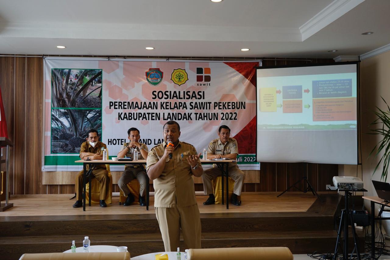 Channeltujuh.com, NGABANG – Kepala Dinas Perkebunan (Kadisbun) Kabupaten Landak Yulianus Edo Natalaga membuka kegiatan sosialisasi kelapa sawit pekebun Kabupaten Landak tahun 2022 dalam rangka pelaksanaan Peremajaan Kelapa Sawit Pekebun (PKSP) di Kabupaten Landak tahun 2022 dan dalam kerangka pendanaan Badan Pengelola Dana Perkebunan Kelapa Sawit (BPDPKS) di aula salah satu hotel di Ngabang, Kabupaten Landak, Provinsi Kalimantan Barat.
