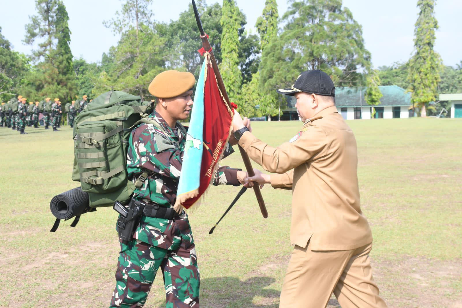 Channeltujuh.com, NGABANG — Penjabat (Pj) Bupati landak Samuel, bertindak sebagai Inspektur Upacara tradisi pemberangkatan 350 personel Satuan Tugas (Satgas) Pengamanan Perbatasan (Pamtas) Indonesia – Malaysia Batalyon Artileri Medan (Yonarmed) 16/Tumbak Kaputing (TK),di Lapangan Yonarmed 16/Tk, Ngabang, Kabupaten Landak, Provinsi Kalimantan Barat.