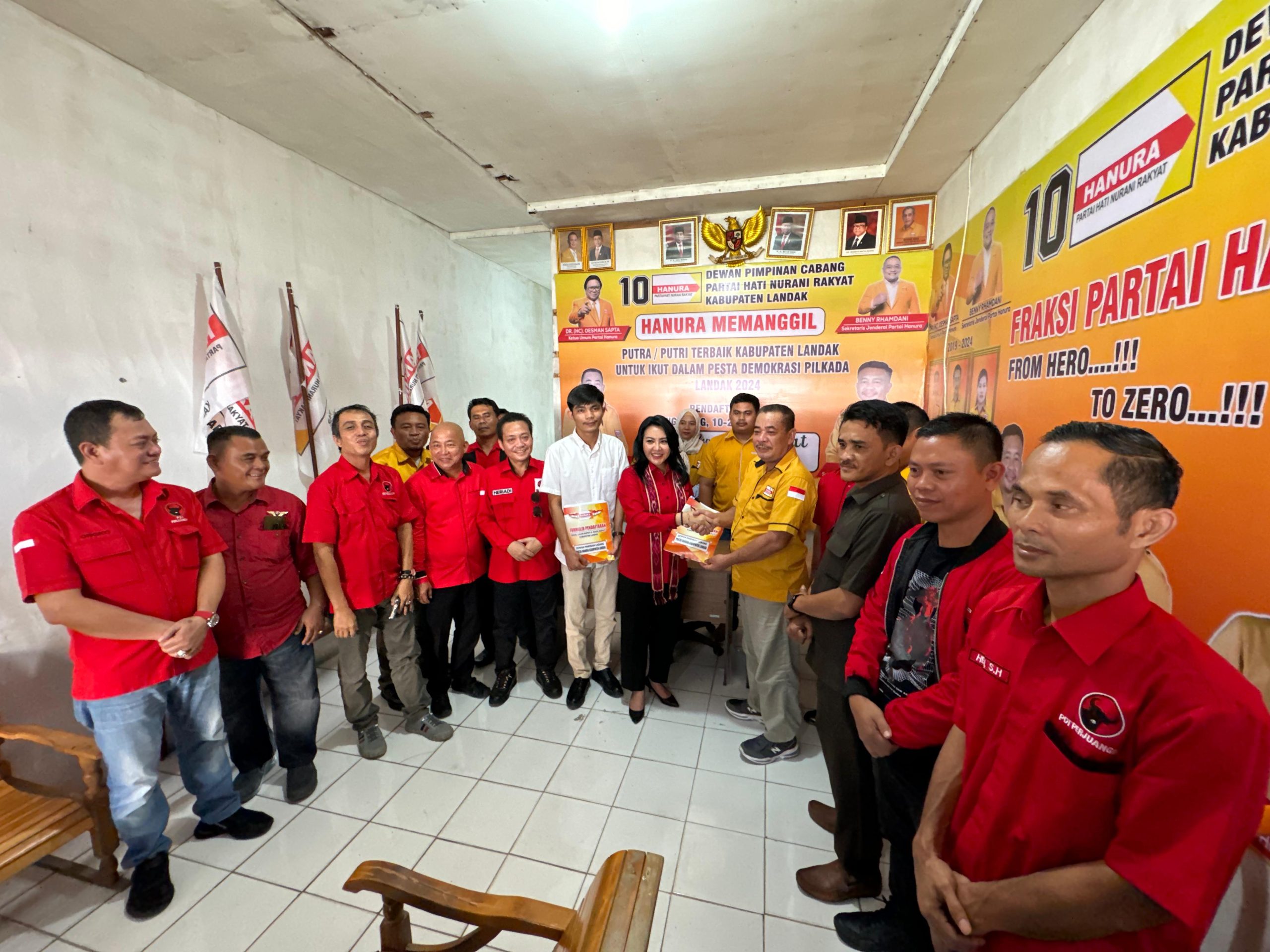 Channeltujuh.com, AMBOYO INTI – Pasangan Bakal Calon (Bacalon) Bupati Landak Karolin Margret Natasa dan Wakil Bupati Landak Erani menyerahkan berkas pendaftaran pada penjaringan rekomendasi di Partai Hati Nurani Rakyat (Hanura) yang diterima langsung Ketua Dewan Pimpinan Cabang (DPC) dan Jajaran pengurus DPC bersama panitia penjaringan penerimaan berkas bacalon Bupati dan Wakil Partai Hanura Landak, di Desa Amboyo Inti, Kecamatan Ngabang, Kabupaten Landak, Provinsi Kalimantan Barat.