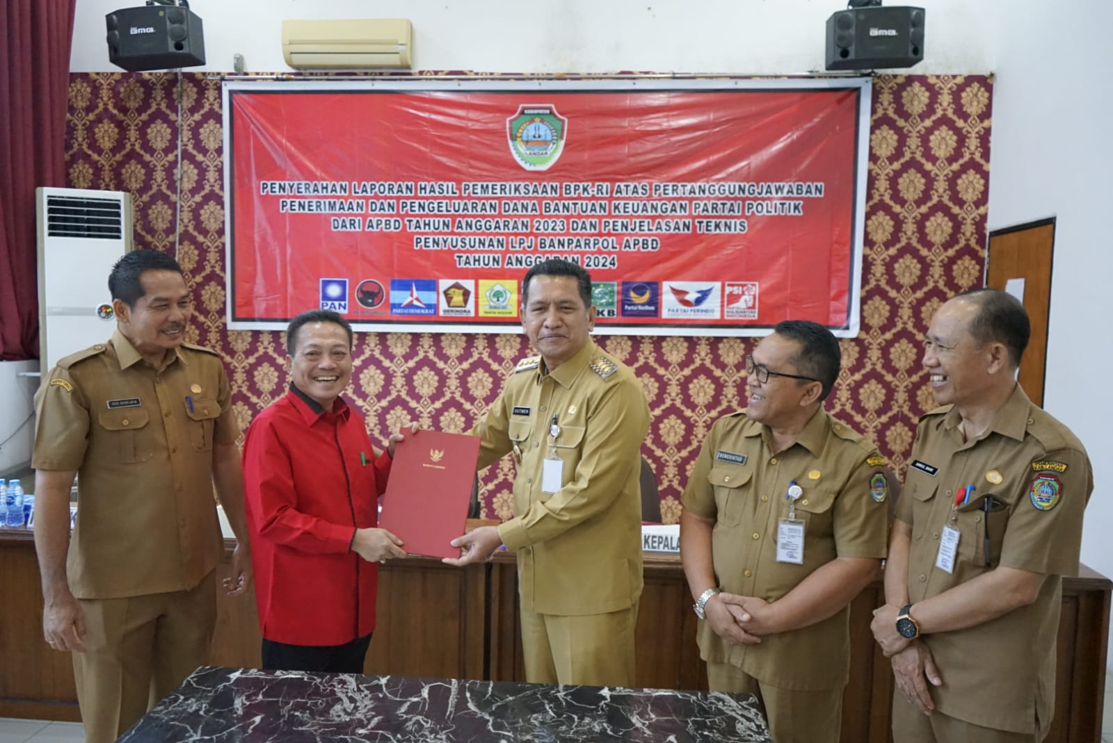 Channeltujuh.com, NGABANG – Pejabat (Pj) Bupati Landak, Gutmen Nainggolan hadiri penyerahan laporan hasil pemeriksaan Badan Pemeriksa Keuangan Republik Indonesia (BPK RI) atas pertanggungjawaban penerimaan dan pengeluaran dana bantuan keuangan partai politik dari Anggaran Pendapatan Belajar Daerah (APBD) tahun anggaran 2023 dan penjelasan teknis penyusunan Laporan Pertanggungjawaban (LPJ) Bantuan Keuangan Partai Politik (Banparpol) Anggaran Pendapatan Belajar Daerah (APBD) tahun anggaran 2024 di Aula Kecil Kantor Bupati Landak, Ngabang, Kabupaten Landak, Provinsi Kalimantan Barat.