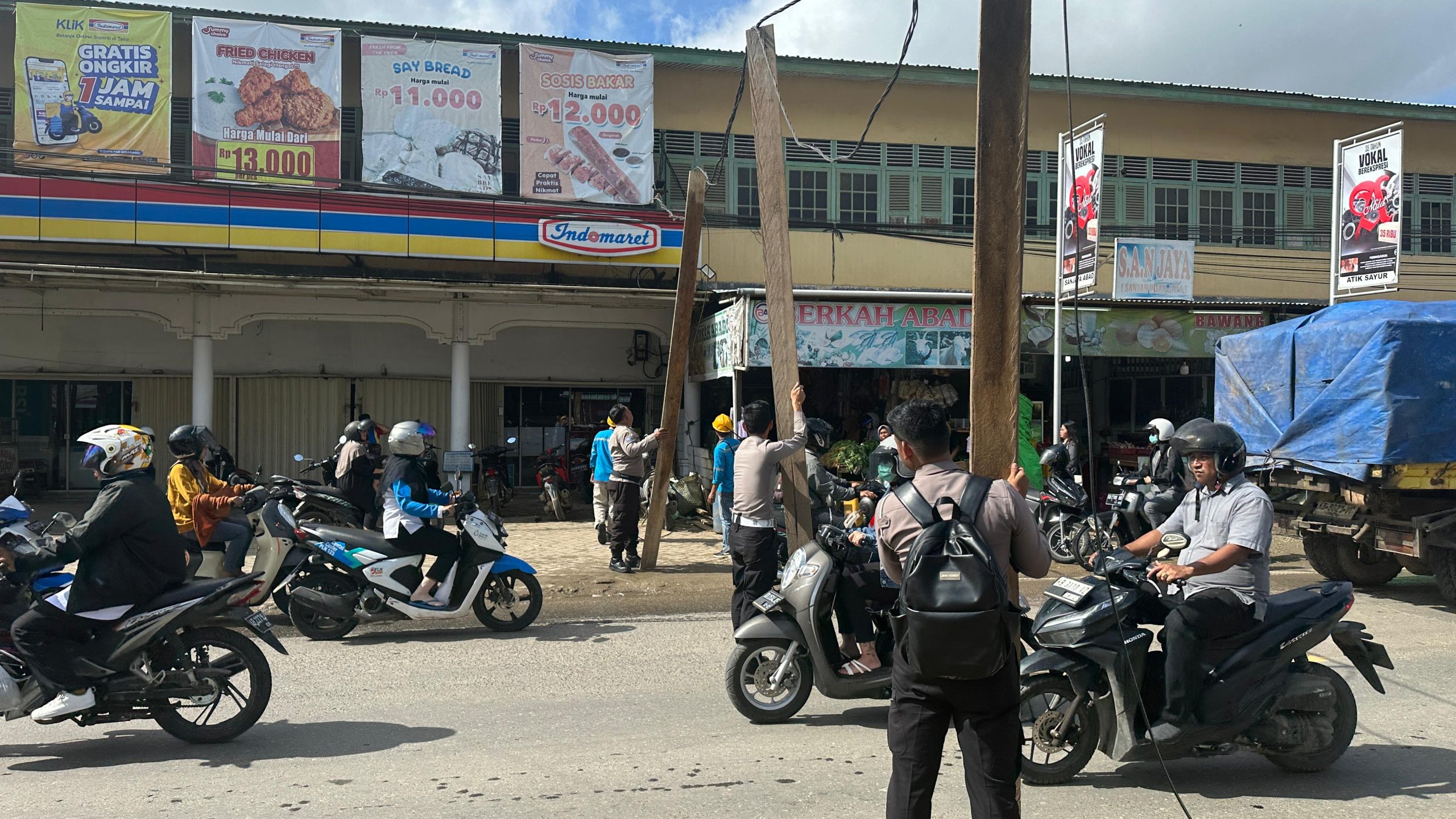Channeltujuh.com, SEKADAU – Gerak cepat Satuan Lalu Lintas (Satlantas) Kepolisian Resor (Polres) Sekadau, mengamankan arus lalu lintas akibat kabel listrik yang menjuntai di badan Jalan Merdeka Timur, Kecamatan Sekadau Hilir, Kabupaten Sekadau, Provinsi Kalimantan Barat.