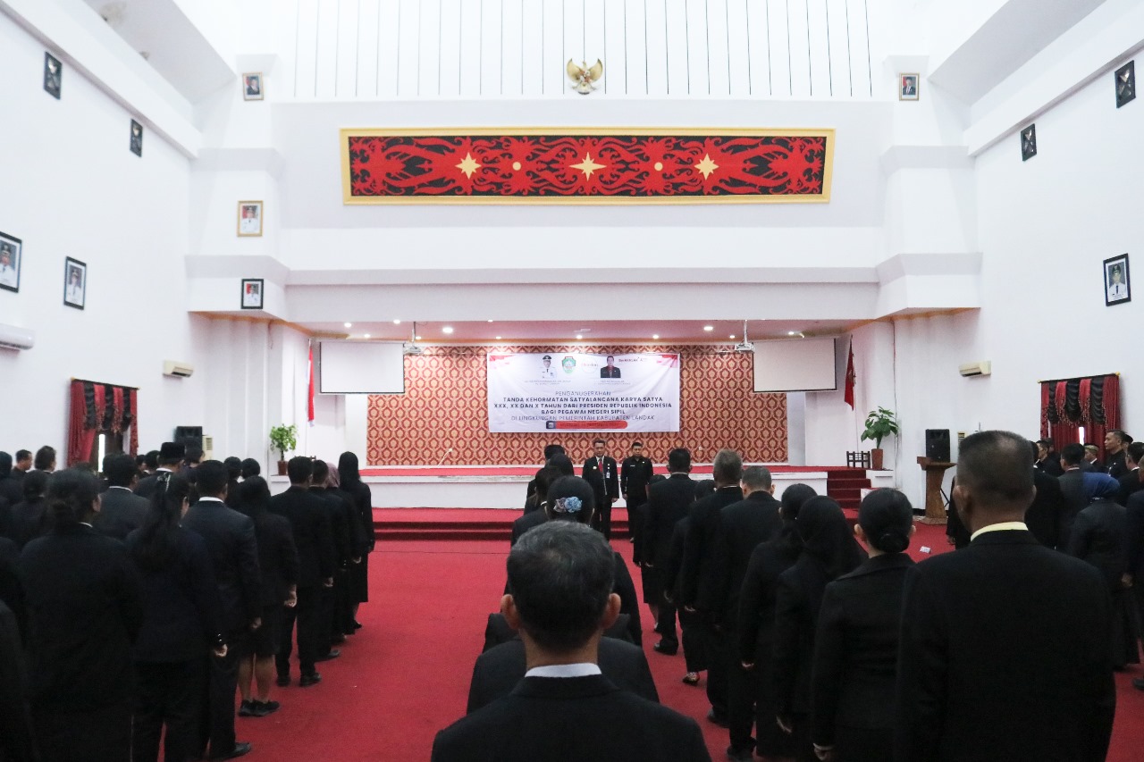 Channeltujuh.com, NGABANG – Penjabat (Pj) Bupati Landak Gutmen Nainggolan sematkan penganugrahan tanda kehormatan Satyalancana Karya Satya 30, 20 dan 10 Dari Presiden Republik Indonesia bagi Pegawai Negeri Sipil (PNS) di lingkungan Pemerintah Kabupaten (Pemkab) Landak tahun 2024, di Aula Besar Kantor Bupati Landak, Ngabang, Kabupaten Landak, Provinsi Kalimantan Barat.
