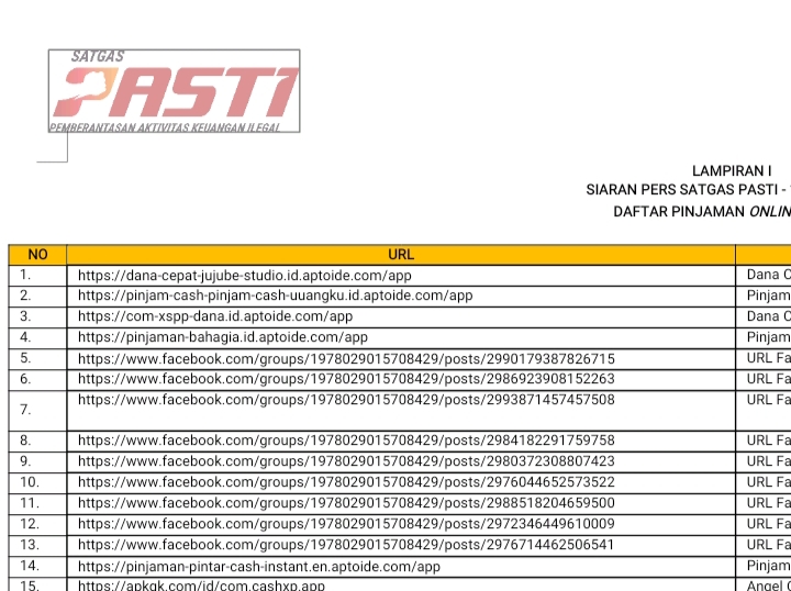 Channeltujuh.com, JAKARTA – Satuan Tugas Pemberantasan Aktivitas Keuangan Ilegal (Satgas PASTI) kembali memblokir 427 entitas pinjaman online ilegal di sejumlah situs dan aplikasi serta enam penawaran pinjaman pribadi (pinpri) yang berpotensi merugikan masyarakat dan melanggar ketentuan penyebaran data pribadi.