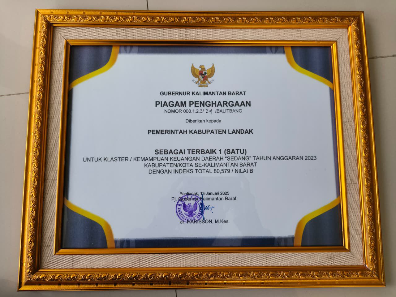 Channeltujuh.com, NGABANG – Pemerintah Kabupaten (Pemkab) Landak menerima penghargaan dari Gubernur Kalimantan Barat dalam pengukuran Indeks Pengelolaan Keuangan Daerah (IPKD) tahun anggaran 2023 tahun ukur 2024 menjadi yang terbaik pada kategori kapasitas fiskal sedang di provinsi Kalimantan Barat dengan indeks 80,579.