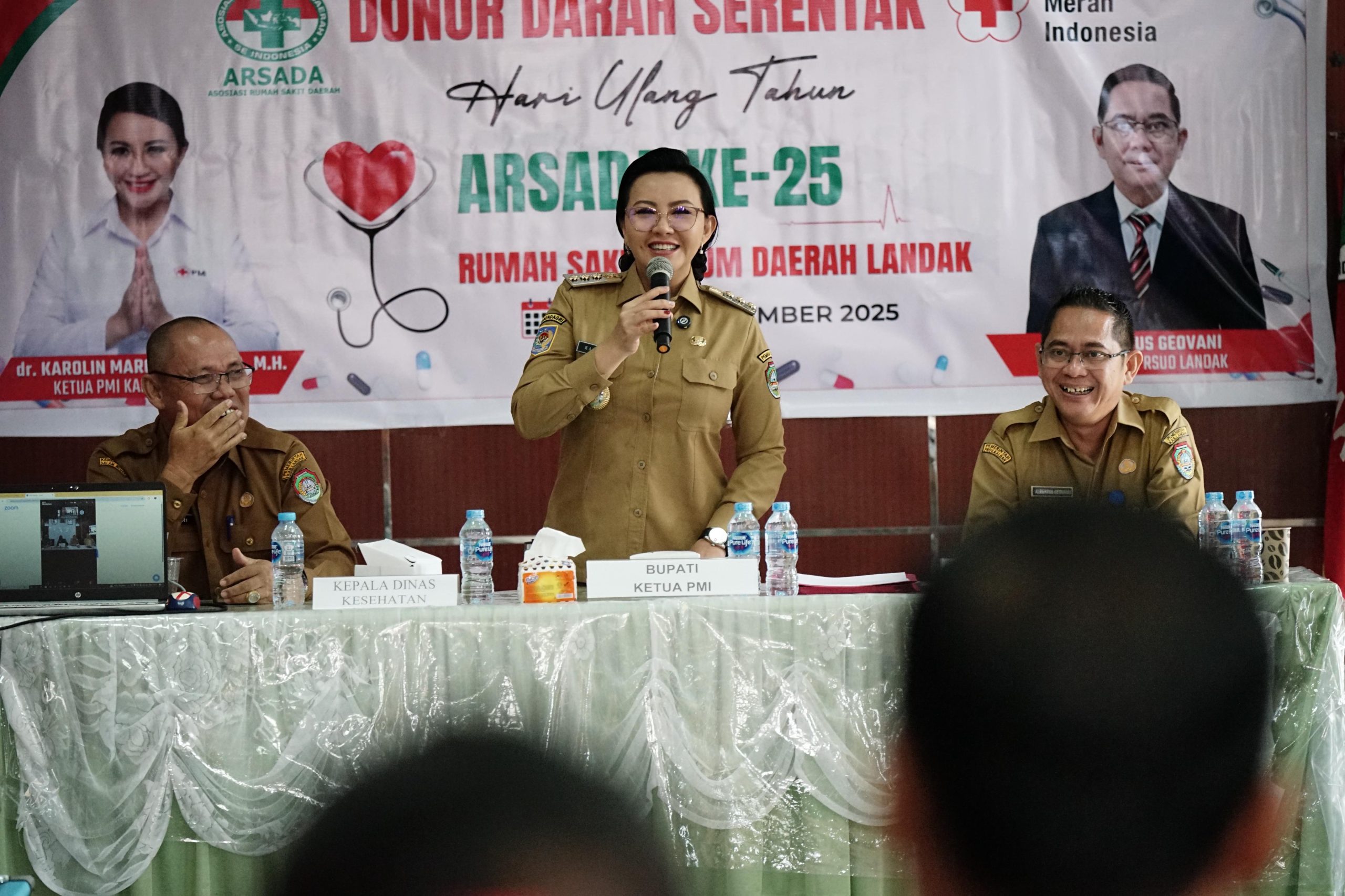 Channeltujuh.com, NGABANG – Bupati Landak Karolin Margret Natasa membuka kegiatan donor darah dalam rangka Hari Ulang Tahun (HUT) Asosiasi Rumah Sakit Daerah Seluruh Indonesia (ARSADA) ke-25, bertempat di Aula Rumah Sakit Umum Daerah (RSUD) Landak, Ngabang, Kabupaten Landak, Provinsi Kalimantan Barat, Senin 3 November 2025.