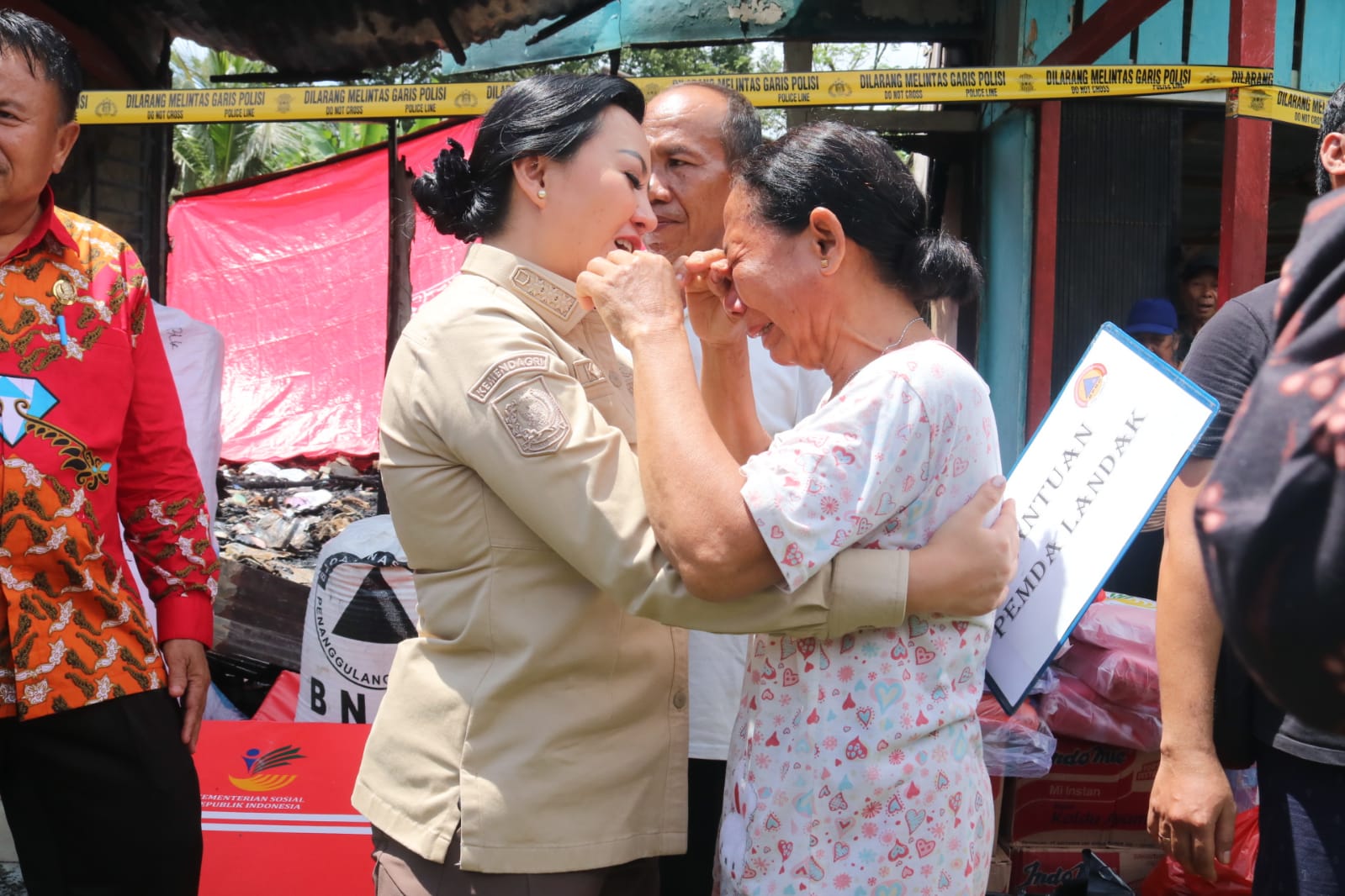 Saat meninjau lokasi, Bupati Karolin Margret Natasa mengungkapkan keprihatinannya terhadap musibah kebakaran tersebut kepada warga pemilik rumah.
