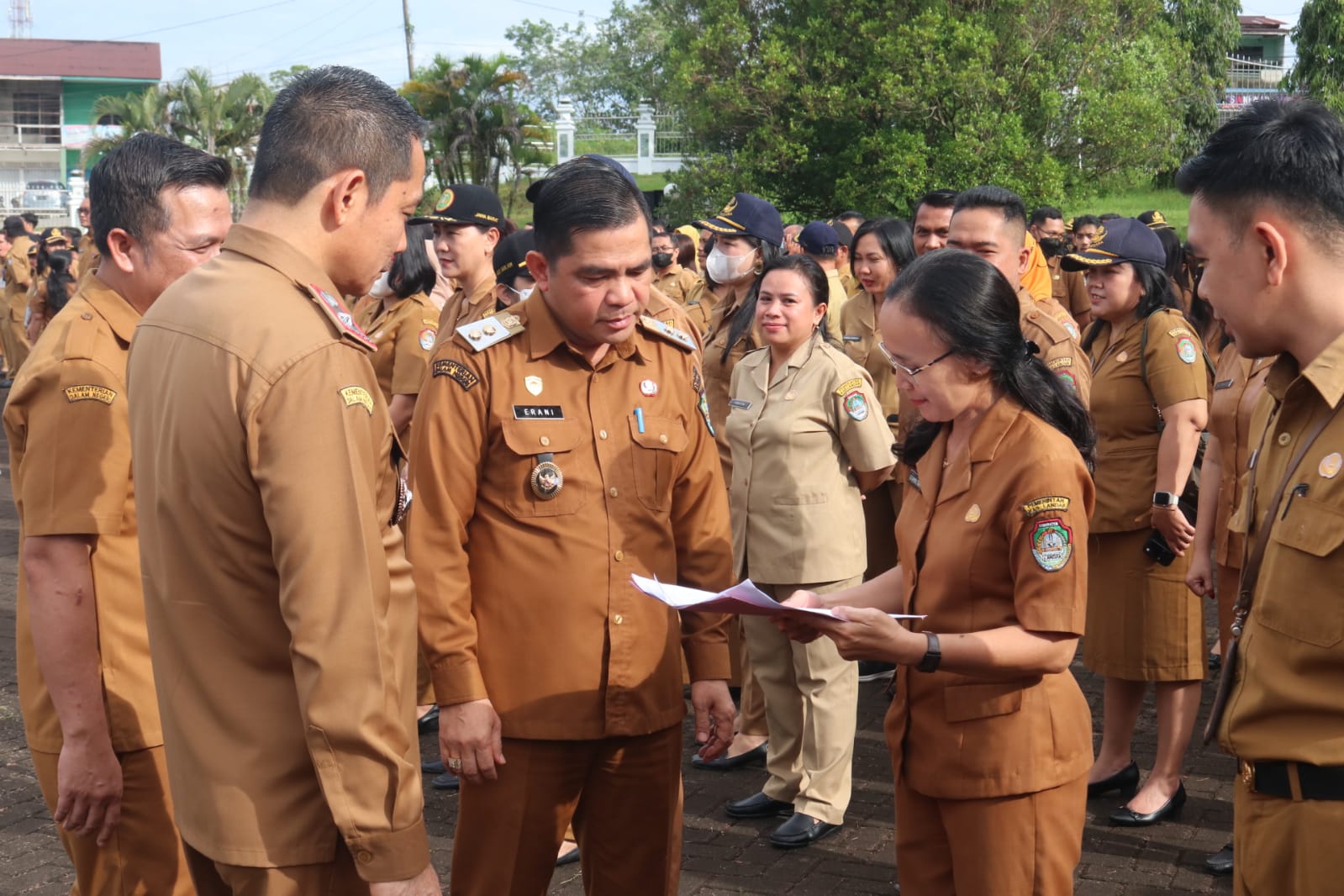 Erani saat membacakan arahan Bupati Landak menyampaikan ucapan terima kasih kepada seluruh ASN yang telah hadir mengikuti apel pengecekan.